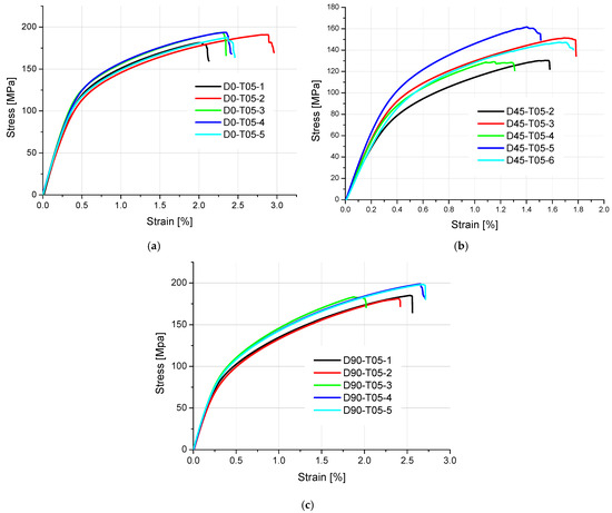Tensile stress–strain curves of 0.5 mm thick samples made of AlSi10Mg aluminum alloy powder: (a) orientation: 0°, (b) orientation: 45°, and (c) orientation: 90°.