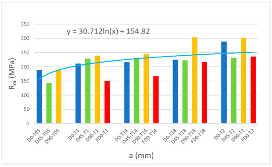 The dependence of the tensile strength of the samples on their thickness for the so-called flat orientation (FD) is presented separately in Figure 11. Among all printing directions, the series of FD samples achieved the lowest strength values while maintaining the trend of increasing strength with increasing sample thickness, which can be approximated by a logarithmic trend line.