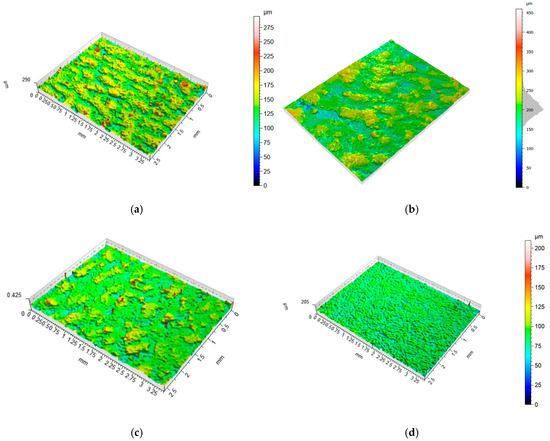 Table 6 shows the determined surface roughness and waviness parameters. In addition, Figure 12 shows the surface view for different printing directions.