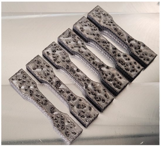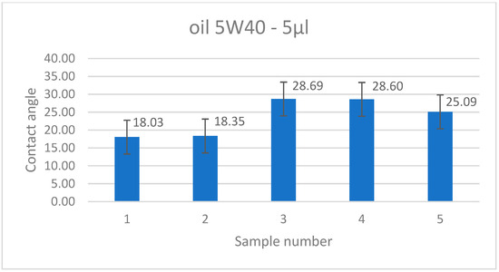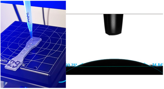 Figure 14 shows an example of the contact angle measurement, and Figure 15 shows the average values of the determined angle for five measurements of 2 mm thick samples, with the models positioned parallel to the 3D printer’s working platform during production.