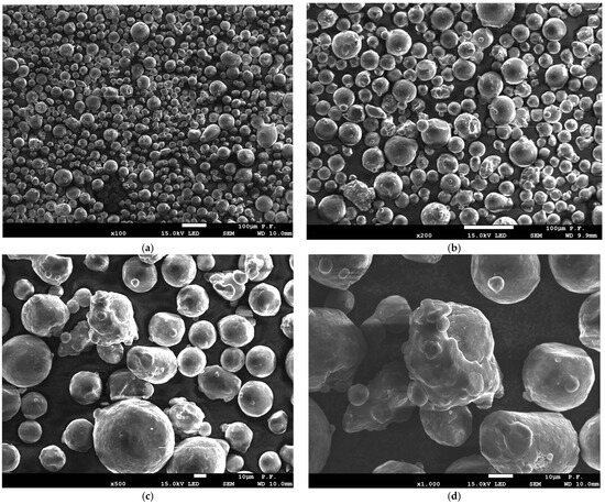 Morphology of powder used for sample production before the melting process: (a) ×100 magnification, (b) ×200 magnification, (c) ×500 magnification, (d) ×1000 magnification, and (e,f) ×2000 magnification.