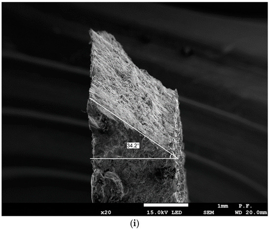 Figure 18 shows microscopic photos of tensional fractures of the samples. The fracture character, fracture angles, and various quality defects are visible.