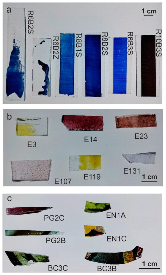 Three sets of samples were analyzed. The first set (Figure 1a), produced in VICARTE laboratories, consisted of blue enamels prepared according to the recipes of the historical treatise The Handmaid to the Arts (1758) by Robert Dossie []. The second set (Figure 1b), produced by J.M. Bonet Vitralls S.L., was prepared using historical enamels from the Rigalt, Granell & cia workshop [] on modern glass. And the third set (Figure 1c) consisted of historical pieces of Catalan Modernist stained-glass windows from the beginning of the 20th century []. The samples were analyzed without any preparation in order to preserve the historical material. To minimize measurement errors, each enamel was measured 3 times in each area, and each sample was analyzed in at least 3 areas (n > 9).