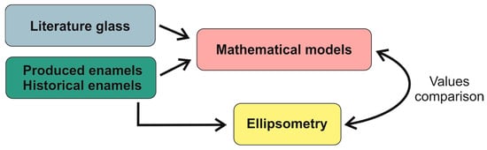 The main objective of this study is to determine the refractive index of the enamel layers (high-lead glasses) on historical glasses. For this purpose, different mathematical models from the bibliography for silicate glasses [,] and lead glasses [,] were evaluated for glasses with chemical compositions similar to historical enamels. The feasibility of applying non-destructive ellipsometry to historical enamels was also assessed, and, finally, the agreement between mathematical and the experimental results was evaluated.
