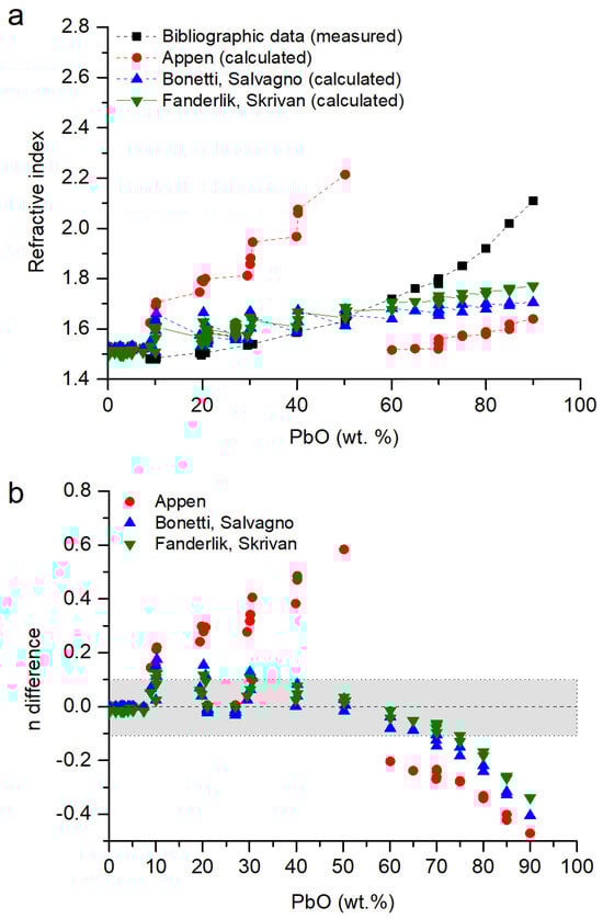 (a) Refractive index of lead borosilicate glasses. Data from [,,,] compared with data calculated following the Appen model [], the Bonetti and Salvagno model [] and the Fanderlik and Skrivan model []. (b) Difference in the values of the refractive index following ndifference = nmodel − nmeasured. In grey, the values with n ± 0.1.