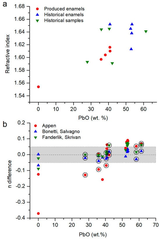 (a) Representation of the refractive index in function of the PbO content on the samples from sets 1, 2 and 3. (b) Difference between the refractive index value (ndifference = nmodel − nmeasured) calculated following the Appen model [], the Bonetti and Salvagno model [] and the Fanderlik and Skrivan model [] model and measured via ellipsometry (Table 1). The circles indicate the altered historical enamels. In grey, the values with n ± 0.05.