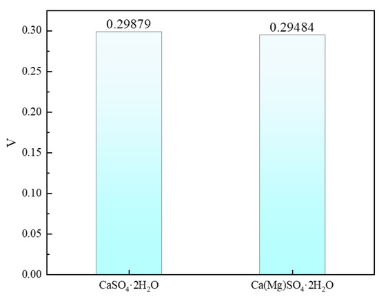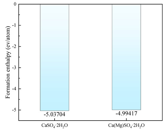 As shown in Figure 3, the mixed enthalpies of pure CaSO4⋅2H2O and Mg-doped CaSO4⋅2H2O were compared. The results indicate that the mixed enthalpy slightly increases after Mg doping, reaching −4.99417 eV, but still remains below zero. The stability of crystal structures can be determined by whether the mixed enthalpy is less than zero: if the mixed enthalpy is greater than zero, the crystal structure is unstable; if the mixed enthalpy is less than zero, the crystal structure is stable. Therefore, the system with Mg doping, having a mixed enthalpy that is still below zero, can be considered stable.