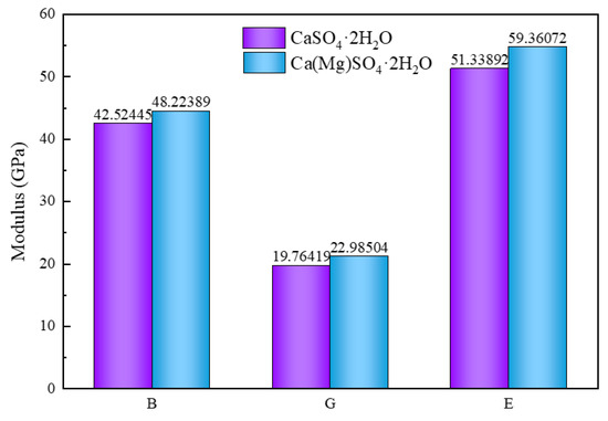- The volumetric modulus, shear modulus, and Young’s modulus of CaSO4⋅2H2O are 42.52445, 19.76419, and 51.33892 GPa, respectively. After the addition of Mg, these properties increased by 13.43803%, 16.29639%, and 15.62518%, respectively.