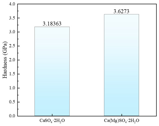 In this study, we used Formula (18) to determine the hardness of CaSO4·2H2O before and after Mg doping. The hardness values are presented in Figure 6. The hardness of CaSO4·2H2O is 3.18363 GPa, while after Mg doping, the hardness of Ca(Mg)SO4·2H2O reaches 3.6273 GPa, representing a 13.9359% increase in hardness. Material hardness is typically associated with compressive performance, where higher hardness indicates the ability to withstand greater pressure without damage. The increase in hardness of CaSO4·2H2O after Mg doping suggests that Mg doping enhances the compressive performance of phosphogypsum.