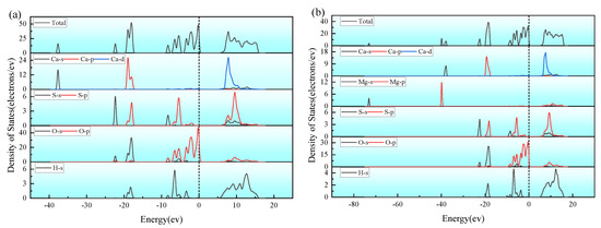 To elucidate the mechanism of Mg doping’s impact on the electronic properties of CaSO4·2H2O, the density of states (DOS) for CaSO4·2H2O and Ca(Mg)SO4·2H2O was calculated.