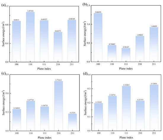 To establish interfaces between CaSO4·2H2O/MgSO4, CaSO4·2H2O/Mg(OH)2, and CaSO4·2H2O/MgCl2, five low-index surfaces of CaSO4·2H2O with Mg(OH)2, MgCl2, and MgSO4 were cut. The surface energies of CaSO4·2H2O and the five surfaces with Mg(OH)2, MgCl2, and MgSO4, which are (100), (110), (111), (210), and (211) respectively, were calculated. The magnitude of the surface energy indicates the stability of the surface; the lower the surface energy, the more stable the surface [45]. The formation of an interface is usually by the surface with the lowest surface energy. To construct the interface between CaSO4·2H2O and different magnesium salts (Mg(OH)2, MgCl2, MgSO4) and to verify the interfacial binding properties between CaSO4·2H2O and various magnesium salts, surfaces for constructing the interface were selected. The formula for calculating surface energy is as follows [46]: