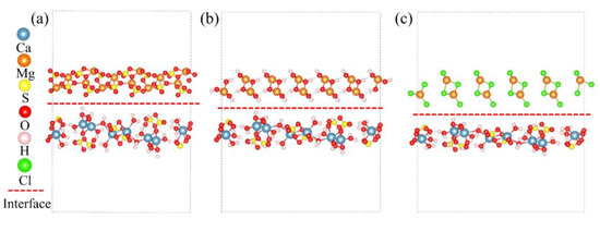 Based on the calculated surface energy results, interface models of CaSO4·2H2O/MgSO4, CaSO4·2H2O/Mg(OH)2, and CaSO4·2H2O/MgCl2 were constructed. The constructed interface models are shown in Figure 9. Subsequently, the interfacial energy and adhesion work of these interfaces were calculated.
