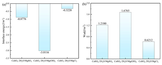 The interfacial energy and adhesive work for CaSO4⋅2H2O/MgSO4, CaSO4⋅2H2O/Mg(OH)2, and CaSO4⋅2H2O/MgCl2 are shown in Figure 10. The order of interfacial energy magnitude is CaSO4⋅2H2O/MgCl2 > CaSO4⋅2H2O/MgSO4 > CaSO4⋅2H2O/Mg(OH)2, while the order of adhesive work magnitude is CaSO4⋅2H2O/Mg(OH)2 > CaSO4⋅2H2O/MgSO4 > CaSO4⋅2H2O/MgCl2. Since smaller interfacial energy corresponds to larger adhesive work, the interface becomes more stable. Therefore, the ranking order for interface binding stability is CaSO4⋅2H2O/Mg(OH)2 > CaSO4⋅2H2O/MgSO4 > CaSO4⋅2H2O/MgCl2.