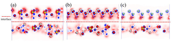 Differential charge density directly reflects the essential characteristics of chemical bonding within a crystal structure. The results are shown in Figure 11, where the blue regions represent gained electrons, and the red regions represent lost electrons. In the interface structures of CaSO4⋅2H2O/MgSO4 and CaSO4⋅2H2O/Mg(OH)2, oxygen (O) atoms gain electrons, while sulfur (S) atoms, hydrogen (H) atoms, calcium (Ca) atoms, and magnesium (Mg) atoms lose electrons. In the interface structure of CaSO4⋅2H2O/MgCl2, oxygen (O) atoms and chlorine (Cl) atoms gain electrons, while hydrogen (H) atoms, calcium (Ca) atoms, and magnesium (Mg) atoms lose electrons.