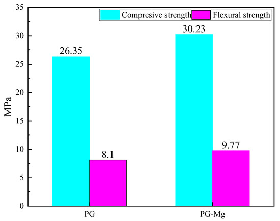 Based on the calculation results, Mg(OH)2 whiskers were chosen to be added to pure phosphogypsum. Subsequently, the compressive strength and flexural strength of the phosphogypsum masonry blocks were tested before and after the addition of magnesium salt whiskers. Compressive strength, a key indicator of material strength in construction, refers to the ability of a material to withstand pressure without breaking. Flexural strength refers to the material’s resistance to bending or twisting forces. Both of these properties are crucial in architectural design as they directly impact the stability, safety, and longevity of structures [49,50,51].