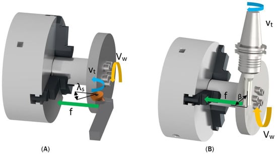In machining processes, the relative movement between the workpiece and the cutting tool is a fundamental determinant of machining performance. This relative motion in machining is a combination of primary and secondary movements. The material removal process is determined by these key movements [1]: the primary movement, also known as cutting speed (vc), and the secondary movement, referred to as the feed rate (f). The desired shape of the machined surface is achieved through the interaction of these movements, the tool geometry, and the positioning of the tool to the workpiece [2]. Turning is one of the most widely used machining technologies. In this process, the workpiece, clamped in the spindle, performs the primary rotational movement, while the cutting tool performs the feed motion. This coordinated movement enables both external and internal turning operations. Due to its versatility, turning applies to a wide range of materials and is regarded as one of the most efficient and cost-effective industrial machining processes. Furthermore, the excess material removed, in the form of chips, can be further recycled, significantly reducing production waste [3,4].