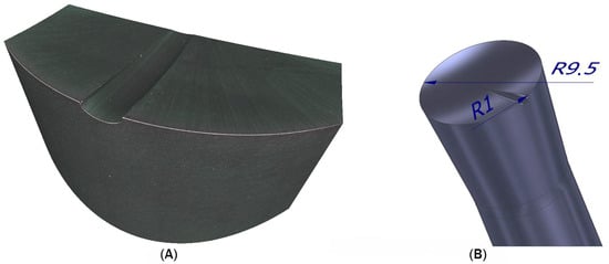 In turning with active tool rotation, achieving the desired surface quality also requires proper chip-breaking. The dimensions and geometry of the tool are based on our previous scientific work and a patented monolithic tool solution. To ensure effective chip segmentation, a variant of the monolithic rotary tool with a chip breaker was designed. The circular rake face of the tool has a cutting section diameter identical to the monolithic tool without a chip breaker, measuring 19 mm. The ground chip breaker is semi-circular in shape with a diameter of 2 mm. Figure 2 presents a scanned image of the cutting section of the tool with the chip breaker, along with a model of the cutting section, including the dimensions of both the cutting edge and the chip breaker.