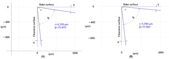 The manufactured tool had slight variations in geometry at the chip breaker location compared to areas without it (Figure 3). Outside the chip breaker, the tool had a rake angle of γ = 8.4° and a clearance angle of α = 6.1°, with a cutting edge rounding radius of r = 6.35 µm. At the chip breaker location, the rake angle was γ = 5.8°, and the clearance angle was α = 6.3°, while the cutting edge rounding radius was r = 5.789 µm. TripleCoating Cr, which is applied using PVD technology, was selected for the construction of the tool with a chip breaker. This coating consists of an adhesive TiN layer, a middle AlTiN layer, and a top CrAlSiN layer. The coating combines the toughness and hardness of the middle AlTiN layer with the hardness of the nanocomposite CrAlSiN top layer. This coating is specifically designed for machining hardened and corrosion-resistant materials.