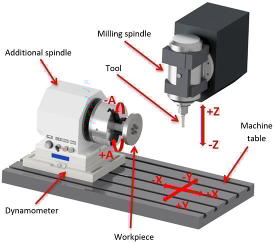 The turning experiments with active tool rotation were conducted on a Hurco VMX 30T (Hurco Company, Indianapolis, IN, USA) three-axis milling center. This milling center has a worktable with dimensions of 1020 × 510 mm and a maximum load capacity of 1000 kg. The tool storage has a capacity of 24 tools, and the spindle has a rated power of 13.5 kW. To conduct the experiments, a machining system equipped with an additional axis was required to enable workpiece rotation. For this purpose, an auxiliary spindle was installed in the working area of the machine. This spindle allows for the adjustment of workpiece rotation speed, ensuring the required cutting speed is achieved. Furthermore, it enables both clockwise and counterclockwise rotation of the workpiece. The auxiliary spindle supports rotation speeds ranging from 110 rpm to 2100 rpm. When setting the required cutting speed, the spindle speed must be adjusted based on the diameter of the machined sample, which is controlled using a potentiometer.