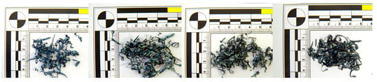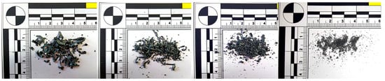 When using a tool with a chip breaker, short helical chips were formed at cutting speeds of 300 and 500 m·min−1 (Figure 13). At a cutting speed of 750 m·min−1, overheating of the generated chips was observed, along with the formation of molten deposits at the chip ends and a color change to gray. The chips became brittle and could be easily crushed by hand. At the highest cutting speed (vw) = 1085 m·min−1), short chips in the shape of ribbons were formed, partially melting due to the intense heat generated during machining.