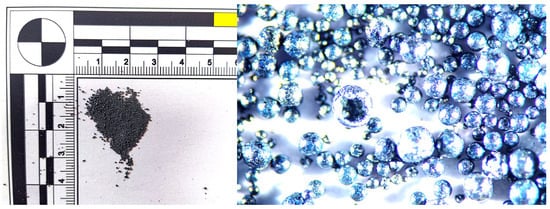 During the analysis of chips generated when using a tool without a chip breaker, it was observed that at a cutting speed of 300 m·min−1, the chips exhibited a blue coloration and formed a short helical conical spiral with a thickness ranging from 0.01 to 0.03 mm. The blue color indicates a high temperature at the cutting zone, leading to chip hardening due to heat treatment. As the cutting speed increased to 500 m·min−1, the chip shape transformed into a continuous spiral, with a thickness ranging from 0.01 to 0.04 mm. At a cutting speed of 750 m·min−1, chip overheating occurred, leading to a color change to gray. Molten deposits formed on the spiral-shaped chips, and chips in the shape of balls also appeared, generated by the melting of the breaking chip due to excessive temperatures. The chip thickness ranged from 0.01 to 0.04 mm. At the highest workpiece cutting speed of 1085 m·min−1, the chips took the shape of balls (Figure 8), with diameters ranging from 0.19 to 0.55 mm.