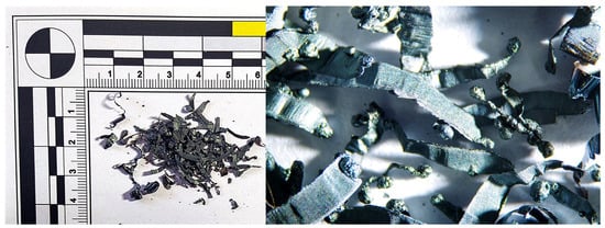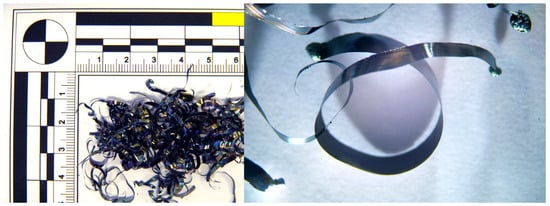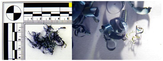 - At the highest cutting speed of 1085 m·min−1, the chip breaker functioned effectively, forming short chips in the shape of ribbons with molten deposits at their ends (Figure 9). The absence of chips in the shape of balls indicates a reduction in temperature.