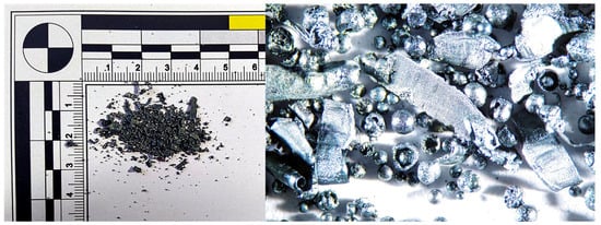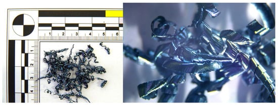 For the tool without a chip breaker, at a workpiece cutting speed of 300 m·min−1 and a sample hardness of 54 HRC, the chips had a similar shape and color to those observed when machining the 50 HRC sample. As the cutting speed (vw) increased to 750 m·min−1, molten chips in the shape of balls were formed (Figure 10), ranging in size from 0.54 to 0.86 mm. However, when using a tool with a chip breaker, no molten chips in the shape of balls were observed (Figure 11).