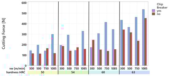 The cutting force had an increasing trend depending on the hardness of the machined material and the cutting speed vw. The lowest cutting force, 113.56 N, was recorded when using a tool without a chip breaker while machining a sample with a hardness of 54 HRC at a cutting speed of 500 m·min−1. In contrast, the highest cutting force, 535.89 N, was achieved with a tool equipped with a chip breaker while machining a 63 HRC sample at a cutting speed of 1085 m·min−1. For a sample hardness of 60 HRC and a cutting speed of 750 m·min−1, the tool with a chip breaker generated three times the cutting force compared to the tool without a chip breaker. Overall, the tool with a chip breaker resulted in higher cutting force values in 81.25% of cases, with an average increase of 1.6 times. The observed increase in cutting force may negatively impact tool wear on the cutting edge and, as a result, reduce tool life.