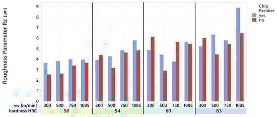 The measured surface roughness Rz ranged from 2.54 µm to a maximum of 8.87 µm. When machining material with a hardness of 50 HRC using a tool with a chip breaker, the recorded surface roughness Rz varied between 3.62 µm and 3.94 µm, which corresponds to the roughness values typical of finishing operations. This range represents the lowest roughness observed across different cutting speeds (vw). As the hardness of the machined material increased, higher Rz values were recorded. However, the change in tool geometry, specifically whether the tool was equipped with a chip breaker and thus introduced an interrupted cut, did not significantly affect the machined surface quality.