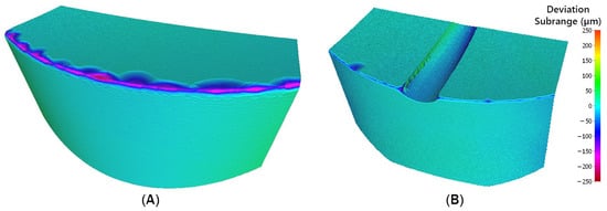 During the machining process, tool wear results from high temperatures generated during material removal, as well as friction between the chip and the tool. The extent of tool wear after the experiments was evaluated using an Alicona Infinite Focus 5G optical microscope. The cutting edges of the rotary tools were scanned both before and after the experiments (Figure 16), and the obtained images were analyzed and compared. Based on this comparison, the extent of tool wear was evaluated.