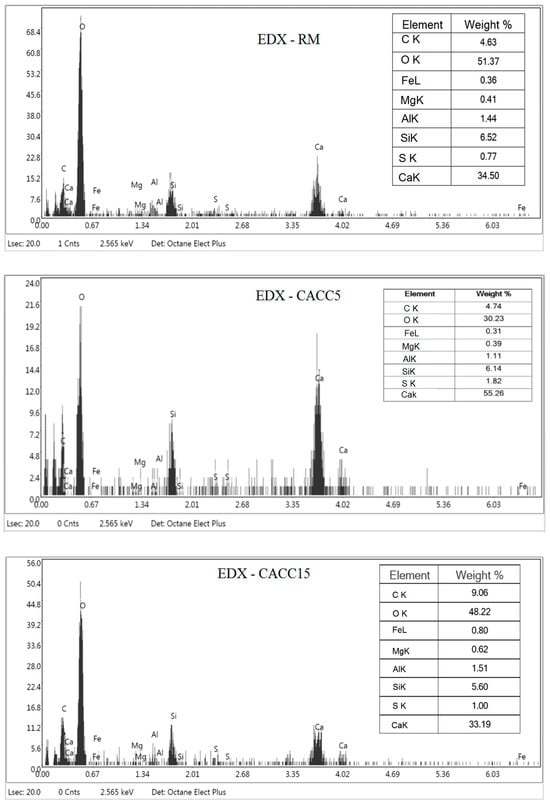 The FTIR spectrum reveals sharper and more intense peaks at 470 cm−1 and 970 cm−1 [44], corresponding to Si-O bending and Si-O stretching vibrations, respectively. These peaks are characteristic of calcium silicate hydrate (C-S-H), a critical hydration product in cement. The increase in their intensity (e.g., absorbance rising from 0.60 to 0.67 for the 470 cm−1 peak and from 0.72 to 0.80 for the 970 cm−1 peak) indicates enhanced hydration in the presence of activated carbon. This observation is corroborated by the EDX spectrum, where silicon (Si) is measured at 6.14 and 5.6 wt% in the CACC5 and CACC15 sample, respectively, compared to 6.52 wt% in the RM sample. Moreover, the results confirm that carbonation is significantly promoted in the CACC cement foam. The FTIR spectrum shows an intensified peak at 1410 cm−1, associated with C-O stretching vibrations of carbonate species (CaCO₃) [45]. This peak’s increased absorbance (from 0.76 to 0.84) suggests greater carbonate formation in the presence of activated carbon. The EDX spectrum supports this observation, with the carbon (C) content rising from 4.63 wt% in the RM sample to 4.74 and 9.06 wt% in the CACC5 and CACC15 samples, respectively. This increase in carbon content reflects the biochar’s integration into the matrix and its role in enhancing carbonation. The interaction between the carbon-rich biochar and calcium ions leads to the formation of stable carbonate phases, which contribute to pore filling, densification of the matrix, and improved durability.
