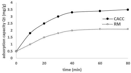 EBT dye kinetic adsorption by CACC and RM (T = 29 ± 1 °C, adsorbent dose 0.3 g CACC15, C0 = 20 mg/L, stirring speed = 0 rpm).