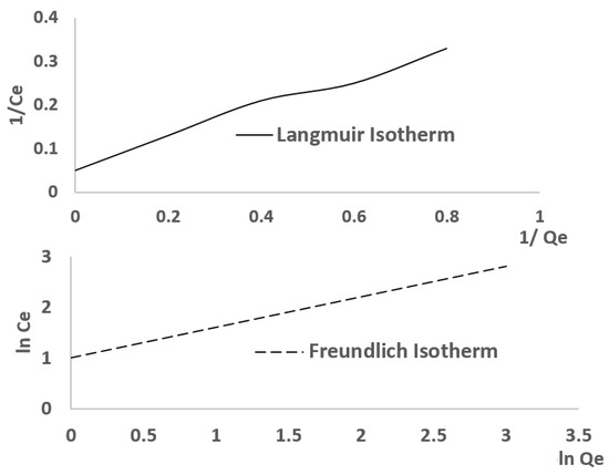 Regarding Figure 8, the adsorption behavior of CACC likely follows the Langmuir isotherm due to its rapid saturation and higher adsorption capacity; however, the Freundlich model provides a better fit (Table 3), indicating slight surface heterogeneity. For RM, the Freundlich isotherm is more appropriate, as its lower adsorption capacity and slower kinetics align with adsorption on a heterogeneous surface. While both materials exhibit some Langmuir behavior, as evidenced by the plateaus in the kinetic curve, the overall isotherm model fitting suggests that the Freundlich isotherm is the dominant model for both materials, particularly for RM. Figure 9 depicts the Langmuir and Freundlich isotherm for the adsorption of EBT on CACC.