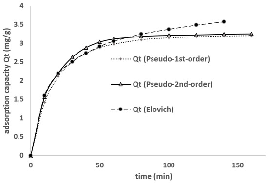 The pseudo-first-order, pseudo-second-order, and Elovich kinetic models (Figure 10) were evaluated, and the summary of kinetic models for EBT adsorption on CACC is shown in Table 4.