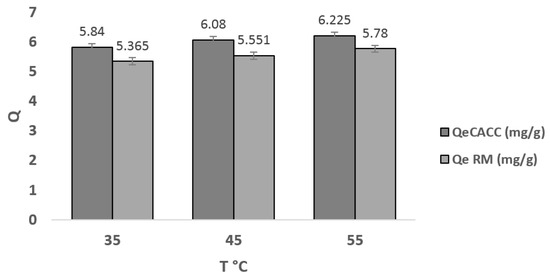 From Figure 11, we observe that the temperature is a kinetic factor favoring the adsorption of the dye and also that the quantity adsorbed increases from 5.84 to 6.225 mg/g for CACC and from 5.365 to 5.78 mg/g for the raw material when the temperature increases from 35 °C to 55 °C. This increase is due to the effect of vibration of the dye molecules with the increase in shock numbers on the surface of the adsorbents. Therefore, the adsorption of the examined ions seems to be an endothermic phenomenon. This could also be due to a relative increase in the mobility of ions in solution, which improves their exposure to active adsorption sites on the one hand and makes it difficult for them to access sites on the other hand.