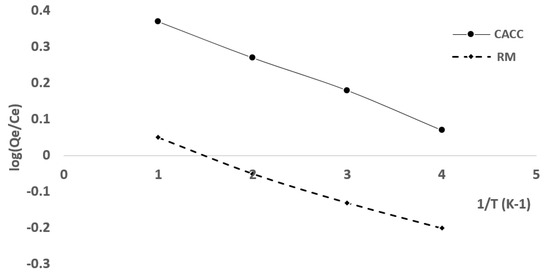 Representation of Van’t Hoff equation for EBT adsorption on CACC15 and on RM.