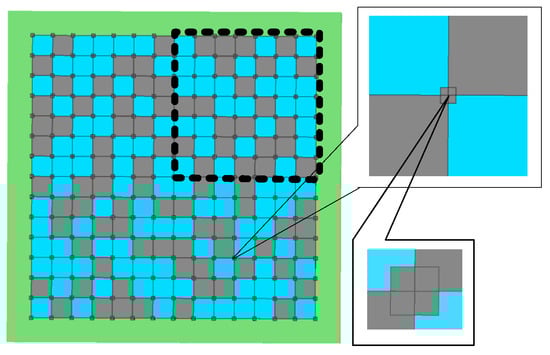 With the development of industrialization in society, various electromagnetic (EM) devices have been designed and applied across multiple fields [1,2,3]. Designing EM devices typically requires theoretical modeling followed by optimization of the design variables. However, due to the complexity of EM theory, designers sometimes need to find optimal solutions within a vast solution space. The size of this solution space is generally related to the number of design variables and their range of values, for instance, designing a random EM metasurface (an application case of the algorithm proposed in this paper) as shown in Figure 1. With each square having two possible materials, even optimizing a 7 × 7 structure results in a solution space size of 249 = 562,949,953,421,312. Generally, when the size of the solution space exceeds one trillion, it is considered a large solution space (LSS) problem. Traditional manual optimization methods become extremely difficult to find the optimal solution at this scale. Hence, the need for automatic EM optimization methods arises.