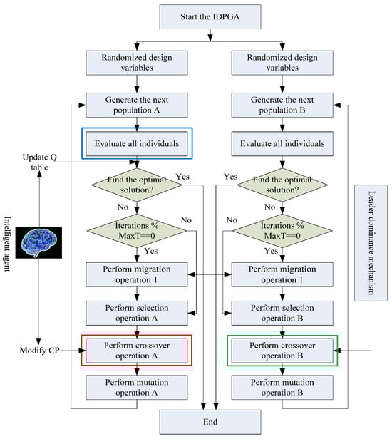 The process of the IDPGA is illustrated in Figure 2. Initially, the algorithm randomly generates a set of EM solutions. These schemes are then randomly split into two equal parts, forming populations A and B. Subsequently, the EM solutions of both populations are evaluated for quality through simulation calls. Once all EM schemes are evaluated, if the optimal solution is found, the algorithm terminates. Otherwise, the iteration count n increases by one. If n is a multiple of a predetermined maximum number of iterations, MaxT, an immigration operator is triggered. If not, populations A and B proceed to execute their respective selection, crossover, and mutation operators to generate the next population.