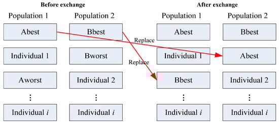 Since the optimization algorithm designed in this paper aims to solve a maximization problem, the higher the fitness value of an individual (i.e., a solution), the better the quality of that individual. The traditional immigration operator first identifies individuals with the poorest fitness value (referred to as Aworst and Bworst) in their respective populations. Then, they replace these poorest fit value individuals with copies of the highest fitness value individuals (referred to as Abest and Bbest) from their own populations, as shown in Figure 3. This means replacing Bworst with a copy of Abest, and vice versa, replacing Aworst with a copy of Bbest. The major drawback of this method is its tendency to disrupt the structure of each population. Consequently, an improved immigration operator is proposed.