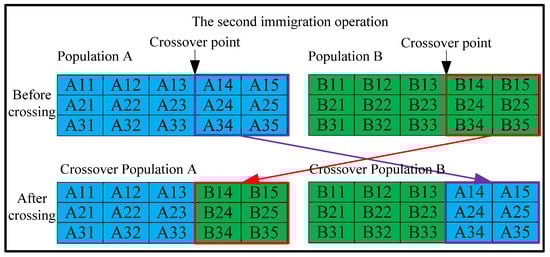 - Immigration operator 2: When the best fitness values of the two populations do not change over several iterations, the immigration operator 2 is triggered, as depicted in Figure 4. Essentially, this operator involves swapping certain design variables of all individuals (except for the best individuals) between Population A and Population B. The purpose of designing this operator is to enable the algorithm to escape local optima.