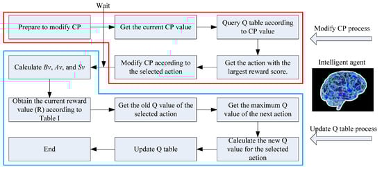 As agents modify the CP by consulting the action with the maximum value in the Q-table, the method of updating the Q-table significantly impacts the agent’s decision-making. Equation (3) is used for updating the Q-table. Q(s, a)old is the estimated reward that the agent might receive for action (a) in state (s), obtained by consulting the Q-table. R represents the actual reward received from the environment after the agent takes action (a) in state (s). Once the agent executes action (a), the state of CP transitions from its original state (s) to state (s + 1). Max(Q(s + 1)) is the highest estimated reward the agent anticipates receiving by making decisions in state (s + 1), which can also be derived from the Q-table. α is the learning rate, and γ is the discount factor, both of which range from 0 to 1. Q(s, a)new is the updated value of the Q-table cell.