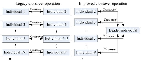 The process of traditional crossover methods is depicted in Figure 6a. Initially, all individuals in the population are randomly paired two-by-two, and then each pair of individuals triggers a crossover operation with a certain probability. The disadvantage of this method is that the optimal individual in the population can only cross with other individuals at most once per iteration, preventing the rest of the population from fully learning the genetic pattern of the optimal individual. In contrast, the improved crossover method differs significantly from the traditional approach, as shown in Figure 6b. The detailed process is as follows: first, the individual with the highest fitness value in the current population is selected as the leader. Then, the remaining individuals cross over with the leader at a certain probability (CP). If an individual does not cross over with the leader, it will then cross over with another ordinary individual with a certain probability (Po) or not cross over at all with a probability (1-Po). As multiple individuals in the population may cross over with the leader due to this leading dominance mechanism, the genetic pattern of the leader is extensively mimicked, thereby rapidly enhancing the overall quality of the population.