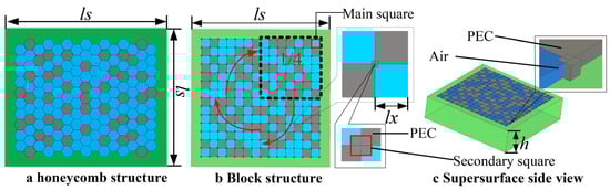 Structure of random lattice electromagnetic super-surface. (a) Honeycomb structure (b) Block structure (c) Supersurface side view.
