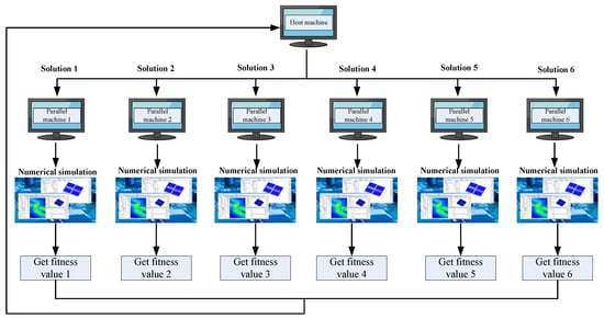 In addition, since the evaluation order of solutions in the population does not affect the iterative results, we employed 10 computers for parallel computing to save solution evaluation time. This created two roles: the host and the parallel machines. The host is responsible for executing the algorithm proposed in this paper, while the parallel machines are responsible for invoking numerical simulations to evaluate the quality of the solutions. When the host generates a new population, all solutions in the population are simultaneously assigned to multiple parallel machines for computation. Once the fitness values of all solutions are calculated, the parallel machines return the fitness values to the host. The host then executes the operators designed in this paper and generates the next population, thus, completing the algorithmic process. As shown in Figure 8.