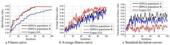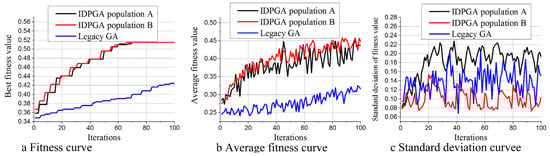 Performance comparison between IDPGA and traditional GA under 7 × 7 structure. (a) Fitness curve (b) Average fitness curve (c) Standard deviation curve.