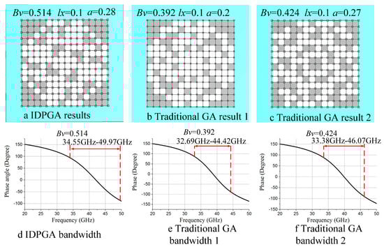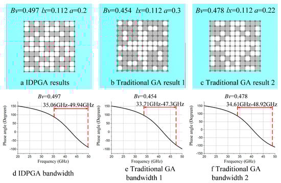 Figure 10a,d displays the optimization results of IDPGA at iteration 66 (Bv = 0.514), which is also the final optimization result achieved by IDPGA. Figure 10b,e shows the optimization results of traditional GA at iteration 66 (Bv = 0.392). Figure 10c,f shows the final optimization results obtained by traditional GA (Bv = 0.424). It is evident that the EM metasurface structures corresponding to the three results vary significantly. In terms of zero-reflection-phase bandwidth, the optimal bandwidth achieved by IDPGA is 34.55 GHz to 49.97 GHz, while the bandwidth achieved by traditional GA is 33.38 GHz to 46.07 GHz. Therefore, IDPGA achieved a wider zero-reflection-phase bandwidth.