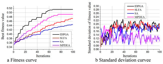 Figure 13a shows the Bv variation curves of all methods, indicating that IDPGA has the fastest growth rate, followed by MPDEA, then SLA, and lastly SA. Figure 13b displays the Sv variations, revealing that IDPGA and SLFA have the largest Sv, closely followed by SA, with MPDEA being the least. Thus, IDPGA’s ability to maintain population diversity is comparable to that of SLFA. The lower diversity in MPDEA is attributed to its greedy strategy for selecting the next generation, which reduces randomness and, consequently, population diversity.