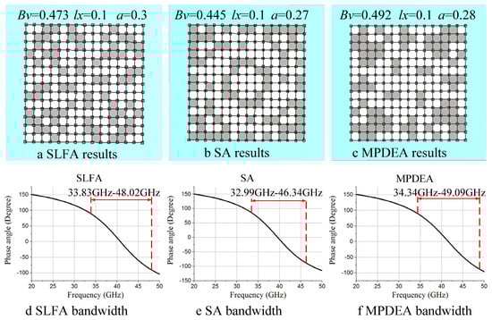 Figure 12a,d shows the optimization results obtained by IDGPA (Bv = 0.497), Figure 12b,e shows the optimization results of traditional GA at iteration 59 (Bv = 0.454), and Figure 12c,f shows the final optimization results obtained by traditional GA (Bv = 0.478). The differences among the three optimized structures are still quite significant. The zero-reflection-phase bandwidth achieved by IDPGA is 35.06 GHz to 49.94 GHz, while the bandwidth achieved by traditional GA is 34.61 GHz to 48.92 GHz. Therefore, it can be concluded that IDPGA still achieves a wider zero-reflection-phase bandwidth under the 5 × 5 structure.