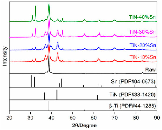 The X-ray diffraction patterns of the surface of the Ti-25Nb-3Zr-2Sn-3Mo alloy before and after SMCS are shown in Figure 2. The coating mainly consists of three phases, Ti, TiN, and Sn, indicating that no alloying occurred during the mechanical ball-milling process. As the proportion of Sn powder increases, the intensity of the diffraction peaks of Sn gradually increases, while the intensity of the diffraction peaks of TiN shows a downward trend. The X-ray diffraction peaks of the sample have broadened significantly after SMCS; the reason for this is that the intense impact of the grinding balls on the sample surface and powder particles causes severe plastic deformation during the ball-milling process, resulting in lattice distortion and the grain refinement of the alloy matrix, TiN, and Sn [21].