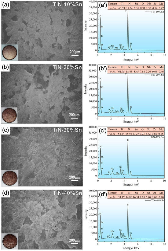 Surface SEM and EDS morphologies of the TiN/Sn coating: (a,a’) 10% Sn; (b,b’) 20% Sn; (c,c’) 30% Sn; (d,d’) 40% Sn.